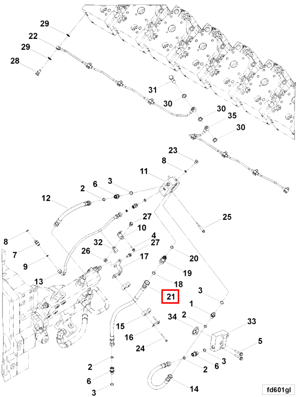 The Fuel Hose also interfaces with the fuel drain system, which is used for maintenance purposes such as draining old fuel or performing system purges. This connection ensures that the fuel can be safely and efficiently removed from the system when necessary, contributing to overall engine health and safety.